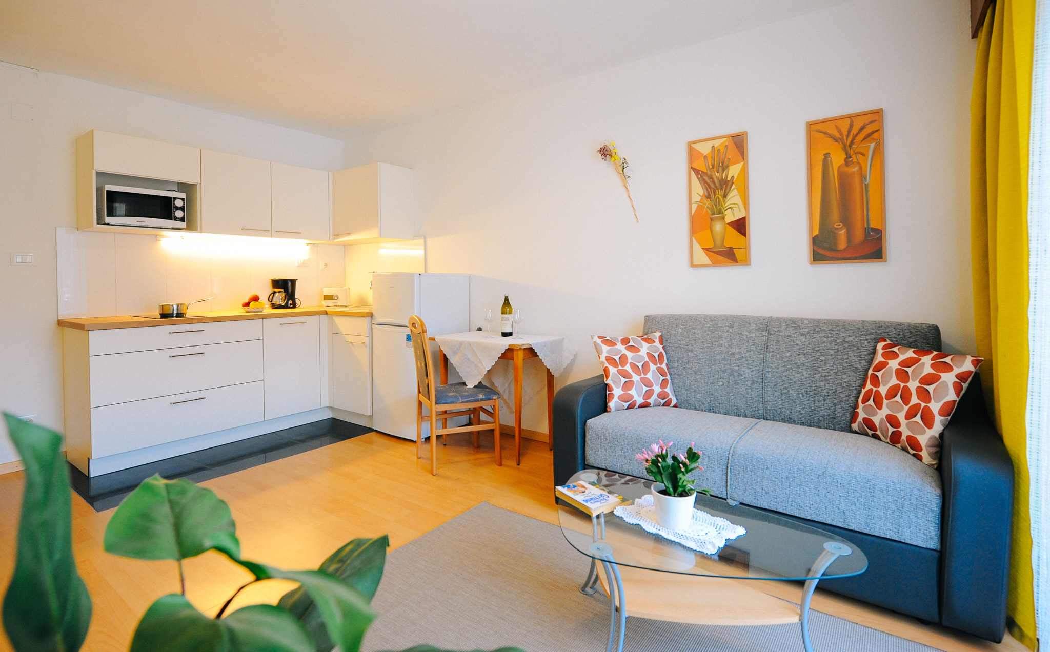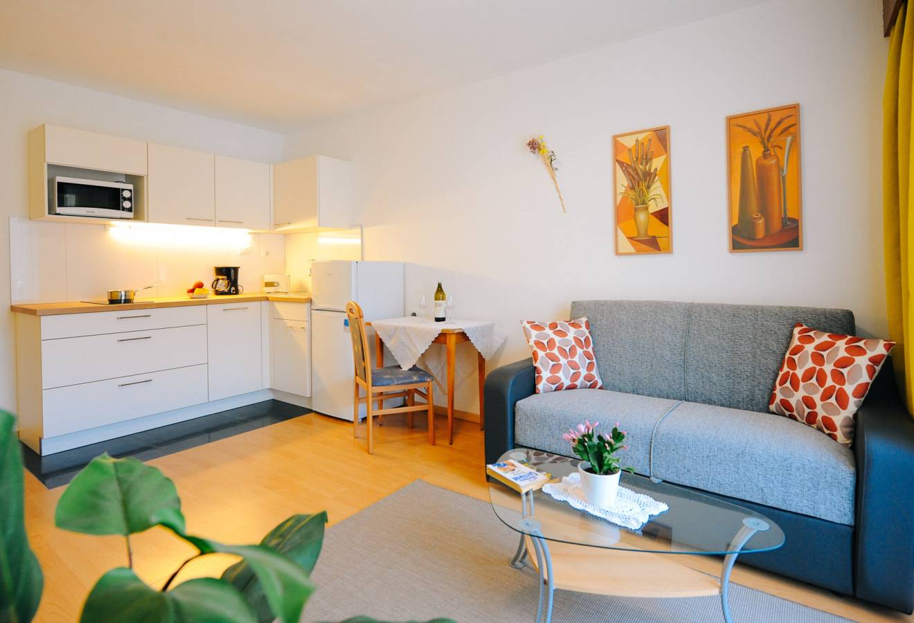 Die Ferienwohnung ist für 2 Personen geeignet und besteht aus einem Schlafzimmer, Dusche und WC, einem separaten Wohnraum mit Küchenzeile, TV, einem Nord- und einem Südbalkon. Die Küche ist mit Kühlschrank, Geschirrspüler, Elektroherd, Mikrowelle, Toaster, Kaffeemaschine und Wasserkocher ausgestattet. Geschirr, Gläser und Bettwäsche sind vorhanden.