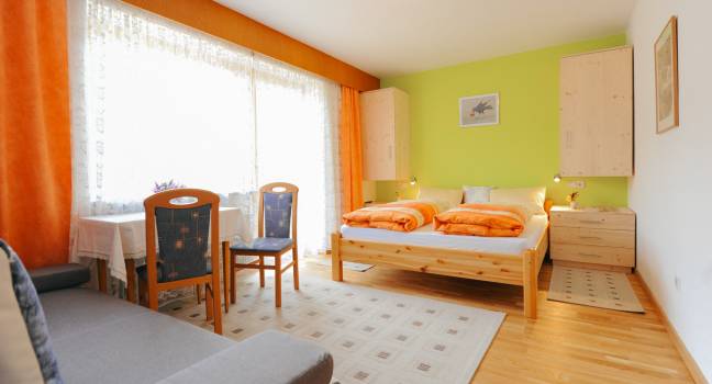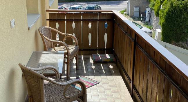 Ferienwohnung für 2 Personen, bestehend aus einem Schlafzimmer, TV, Dusche und WC, einem separaten Wohnraum mit Küchenzeile, TV, einem Nord- und einem Südbalkon. Die Küche ist mit Kühlschrank, Elektroherd, Mikrowelle, Toaster, Kaffeemaschine und Wasserkocher ausgestattet. Geschirr, Gläser und Bettwäsche sind vorhanden.
